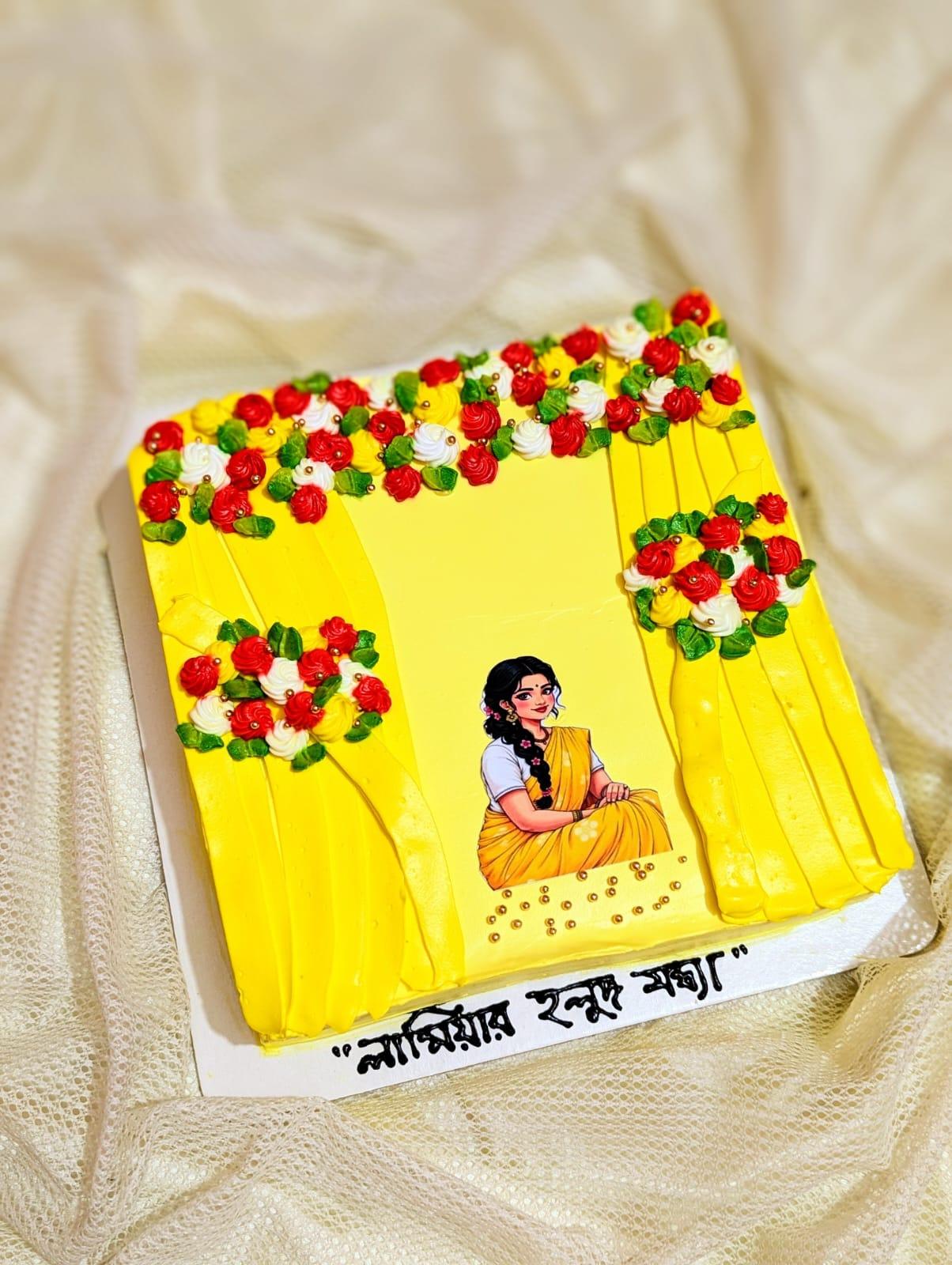 Made with soft, fluffy sponge and layered with smooth, creamy frosting, every bite delivers a rich and delightful taste. The eye-catching design makes it a perfect centerpiece for your Haldi event, adding both sweetness and style to your celebration.